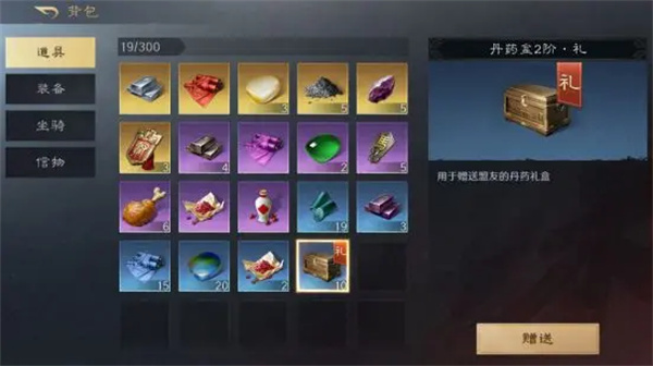 3、打开背包选择“丹药盒X阶·礼”,点击“赠送”。