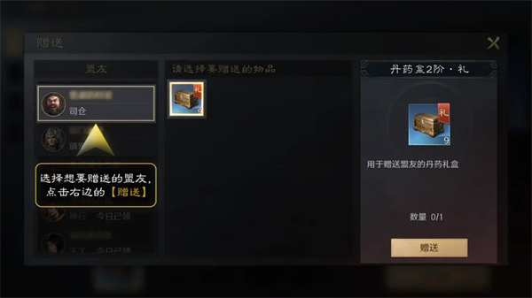 4、选择想要赠送的盟友进行赠送丹药。