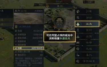 首先我们来看看同盟城池内快速征兵。将军队调动至同盟城池中,然后指令中选择征兵,即可消耗辎重和主城预备兵进行快速征兵。不需要消耗时间,可以飞速补兵然后重新投入战场,这对战况瞬息变化的战场来讲十分的有帮助。