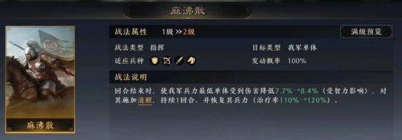 回合结束时,使我军兵力最低单体受到伤害降低7.7%一 14% (受智力影响),对其施加清醒,持续1回合。并恢复其兵力(治疗率110%-200%)