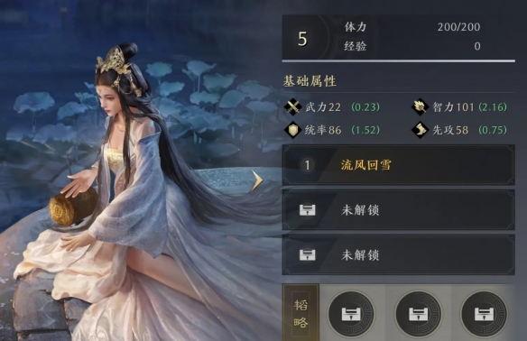 《洛神赋》下卷:自带战法流风回雪的洛神效果优先选择武力最高单本,但伤害提升效果降低5%