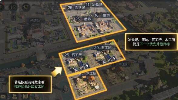 2.在军营之后,冶铁场、磨坊、石工所、木工所四类资源产出型建筑便是下一个优先升级目标,这些建筑升级后,可以显著提升基础资源产出速度,确保资源供应的稳定性,为游戏后期的发展奠定坚实的基础,若是按照消耗数来看,推荐优先升级石工所哦!