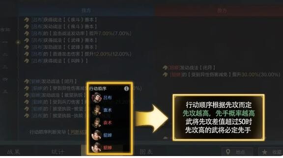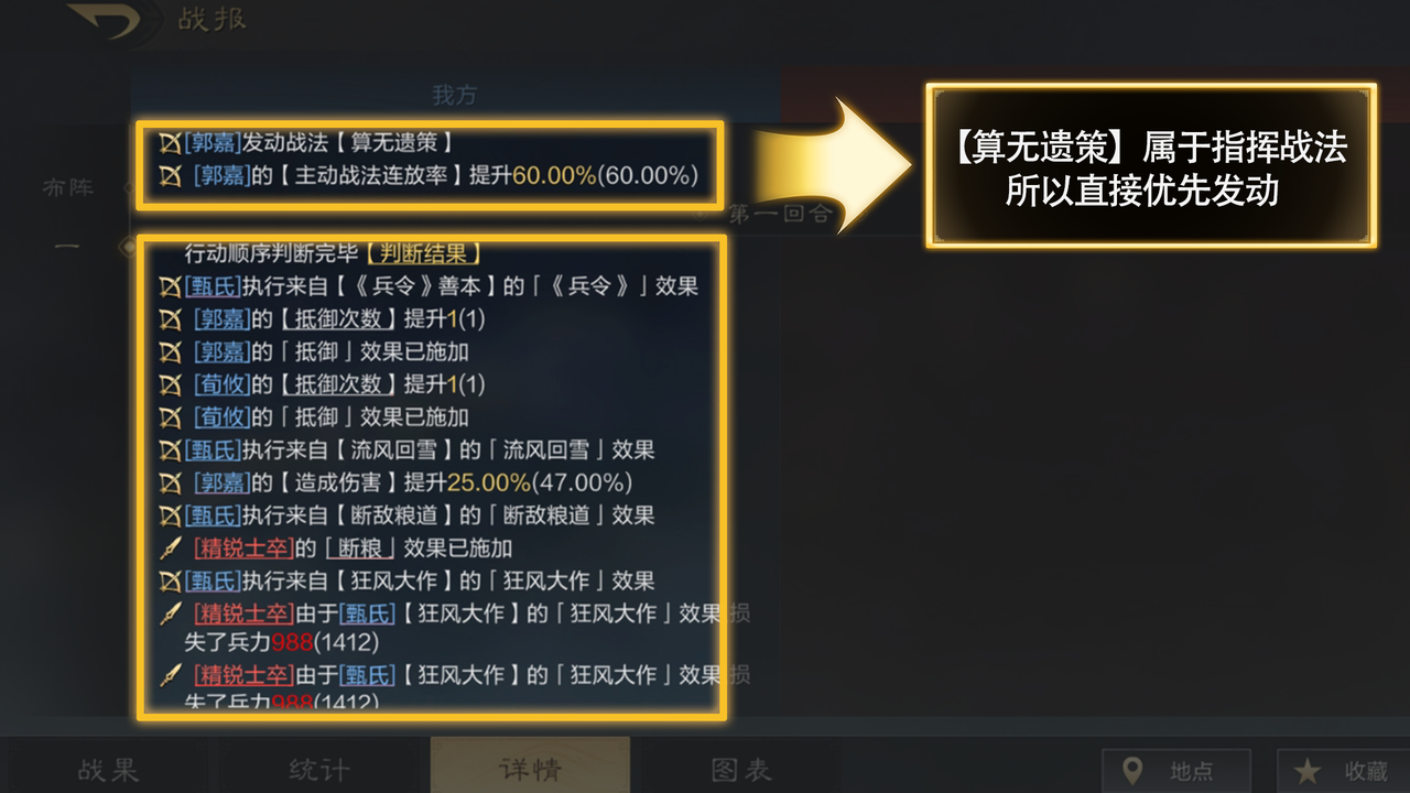 4.所有的指挥战法由于发动概率是100%,所以会先于其他需进行系统判定的战法直接发动,然后再依次按武将行动顺序判定其他战法以及结算。