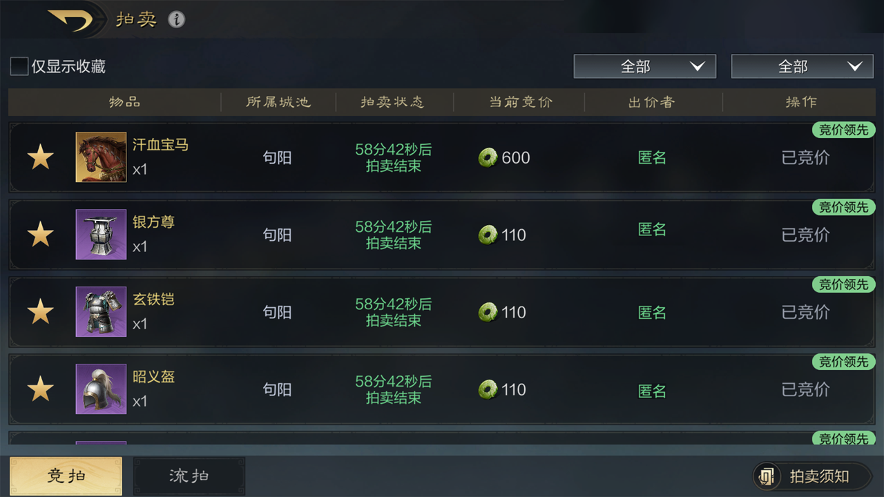 当日清剿叛军营地活动产出的同盟奖励(装备、成套韬略)会进入拍卖场,当日清剿叛军出发前集结的玩家可参与,能以玉石进行竞价,拍卖结束后,物品会以信件方式发送给出价最高者,拍卖所得的玉石将等量转化为黄金,并以信件形式发送分红,按盟内成员的本周同盟贡献与本周武勋的综合排名,来决定分红份额。
