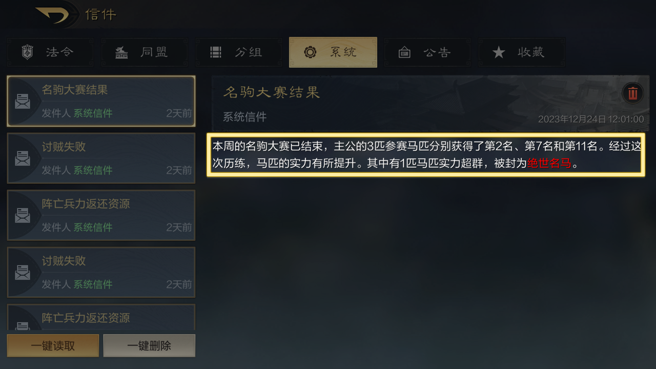就比如马匹的速度会增加,耐力会增加,在得到相应的属性提升后,我们的马匹就能赢得比赛了。值得一提的是,除了比赛胜利的物资奖励以外,这匹马还会被封为绝世名驹,这个时候大家会同步拿到“绝世名驹”这个称号。