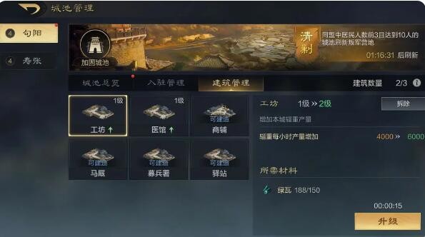 无需繁琐操作,同盟内的所有同盟城池都会自动生产辎重,每小时的产量取决于城池内的“工坊”的等级。所以想要辎重生产效率高,要么多攻占几座城池,要么升级城池内的工坊。