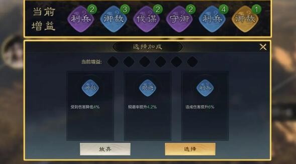 在远征过程中,可以选择6种不同的增益状态,同名同品质的状态可以叠加。当获得的增益状态种类超过6种时,可以选择替换。