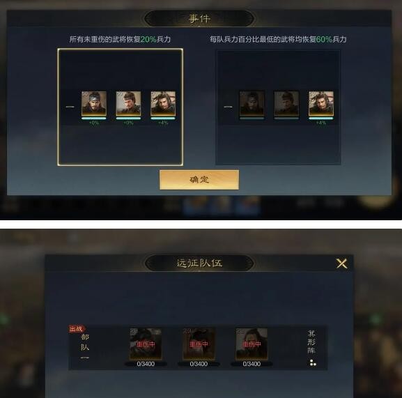 在恢复兵力时,可以选择恢复所有武将的兵力或仅恢复兵力最低武将的兵力。如果出战部队中所有武将的兵力都为0,此次远征将失败。