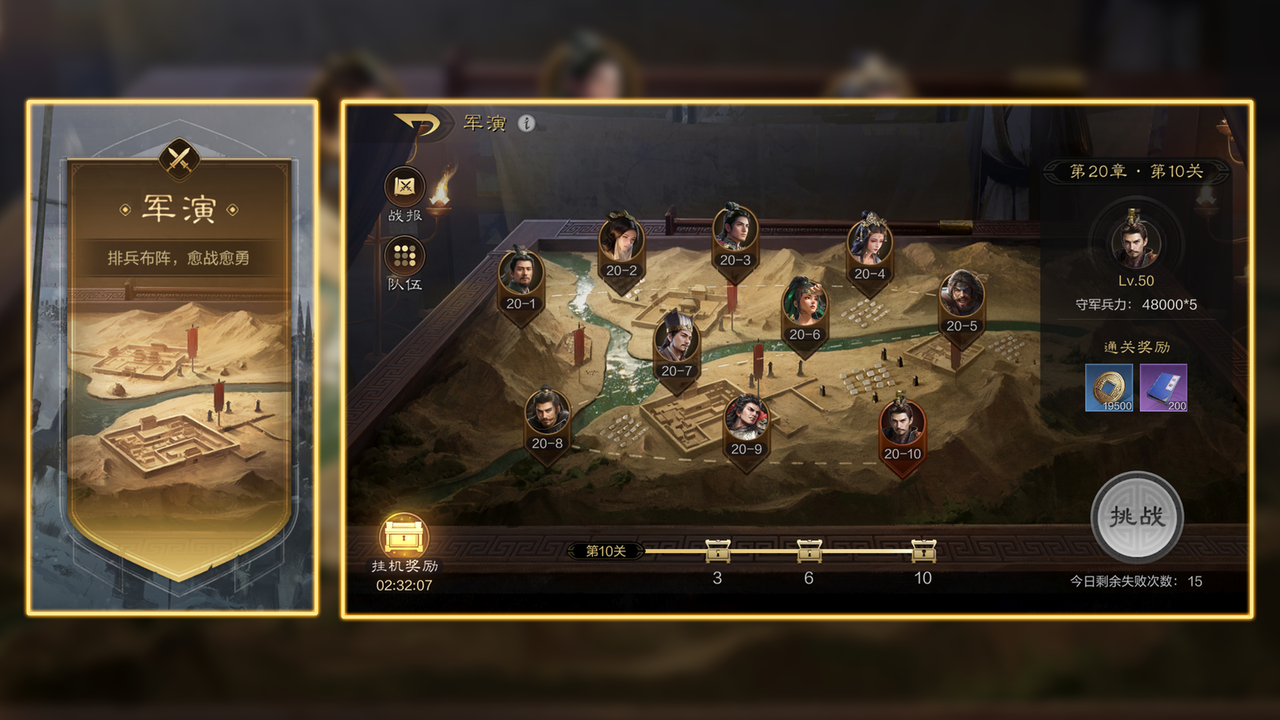通过章节关卡节点(3、6、10),可以领取军演下方的奖励宝箱,获得铜币、相马令和天赋经验。这是前期快速获取铜币的途径,也是获得相马令的好地方。