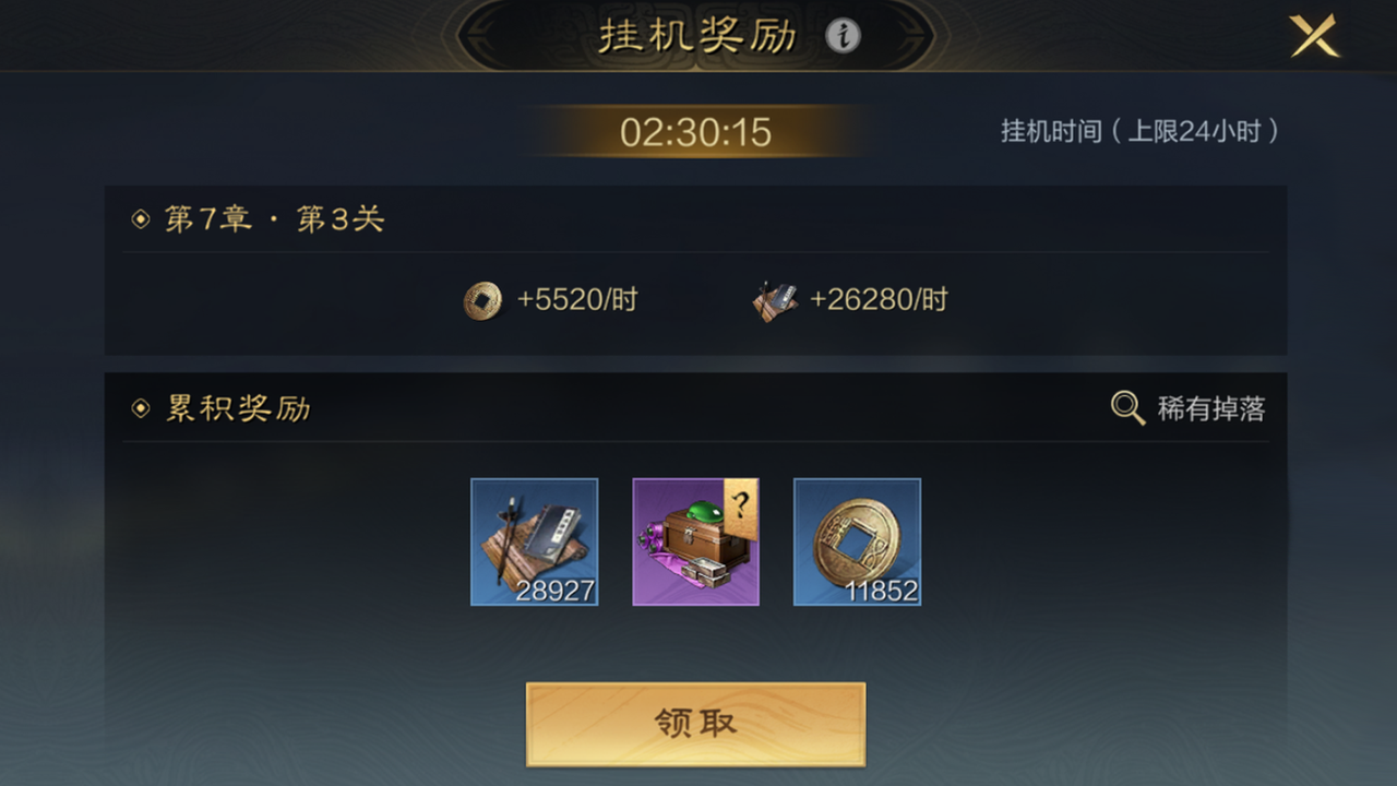 军演左下方可领取挂机奖励,获得储备经验和铜币。军演通过的关卡越多,挂机收益越高,还有几率获得稀有掉落物。但挂机时间上限为24小时。
