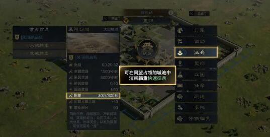 首先我们来看看同盟城池内快速征兵。将军队调动至同盟城池中,然后指令中选择征兵,即可消耗辎重和主城预备兵进行快速征兵。不需要消耗时间,可以飞速补兵然后重新投入战场,这对战况瞬息变化的战场来讲十分的有帮助。