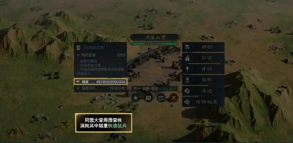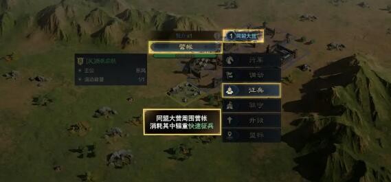 除了可以在同盟城池内快速征兵外,地图上的同盟大营周围的营帐内也可以进行快速征兵。不过这里要注意,营帐也必须要在同盟大营的补给范围内,才能消耗辎重进行征兵,在营帐内快速征兵优先消耗的是同盟大营的辎重,没有的话可以消耗营帐所在县的城池的辎重,当然,前提是所在县的城池要被己方同盟占领。