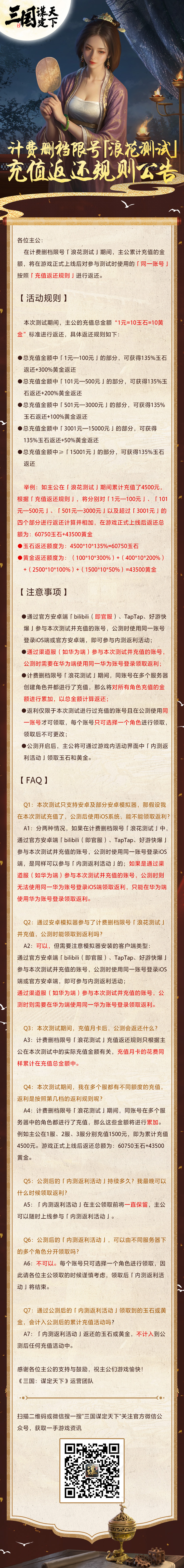 本次测试期间,主公的充值总金额“1元=10玉石=10黄金”标准进行返还,具体返还规则如下: