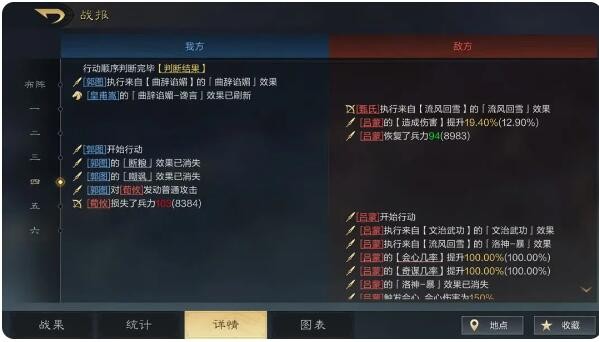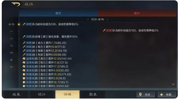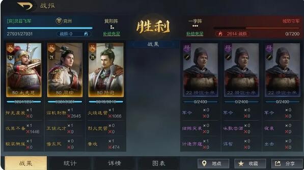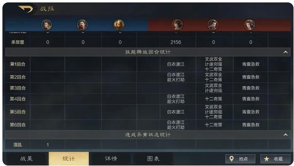 武将释放战法次数,造成的输出和治疗分别是多少,都是我们在战果中可以明确查看到的。
