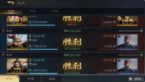今天小编给大家带来了《三国:谋定天下》战报信息获取方法分享,资源州已经开启,想必各位主公已经开始面对各种激烈的战斗了!游戏中战报就看两点,第一点是个人战报还是同盟战报;第二点,开拓还是交战,开拓是自己开垦或打城外地,交战是与玩家战斗。