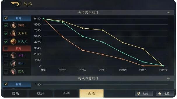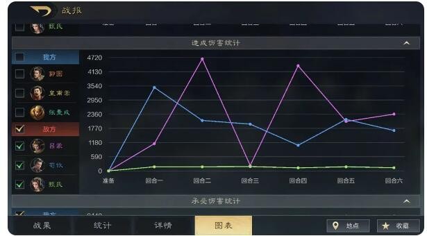 看完战果之后,接下来是图表。图表是直接以图片的形式展示最直观的结果,方便更快速地看到关键点,比如我们的核心角色在前三回合就战败了,那将会直接影响战局,或可查看对面哪位武将伤害最高等等。