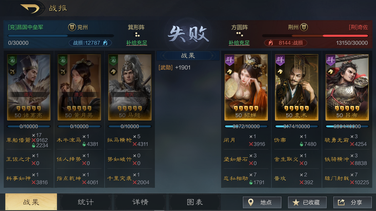 第一步,战果分析,我们看战果可以得到信息,对面吕布释放【辕门射戟】次数很高,反观我方同为兵刃输出的马超却基本没有打出多少输出,因此可以猜测马超在前几个回合就已经退出战斗了。从战果可以粗略得出结论,一是进一步加强前排吸引火力的能力如带坚如磐石,或加强辅助的回血能力带青囊急救;二是考虑换成反击队伍来克制吕布。
