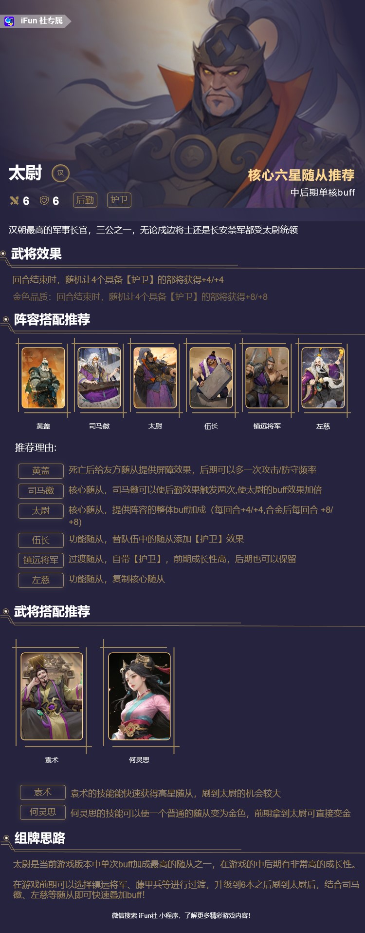 司马徽:核心随从,司马徽可以使后勤效果触发两次,使太尉的buff效果加倍