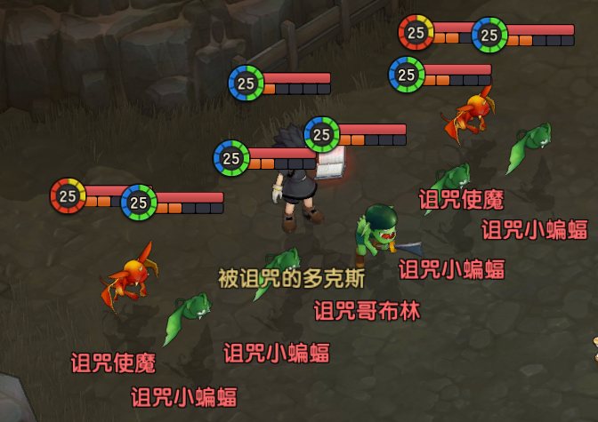 1星魔物首领魔物介绍:前排中间为哥布林,其余均为小蝙蝠,后排左右两侧为使魔,中间为魔物首领(咒术师)
