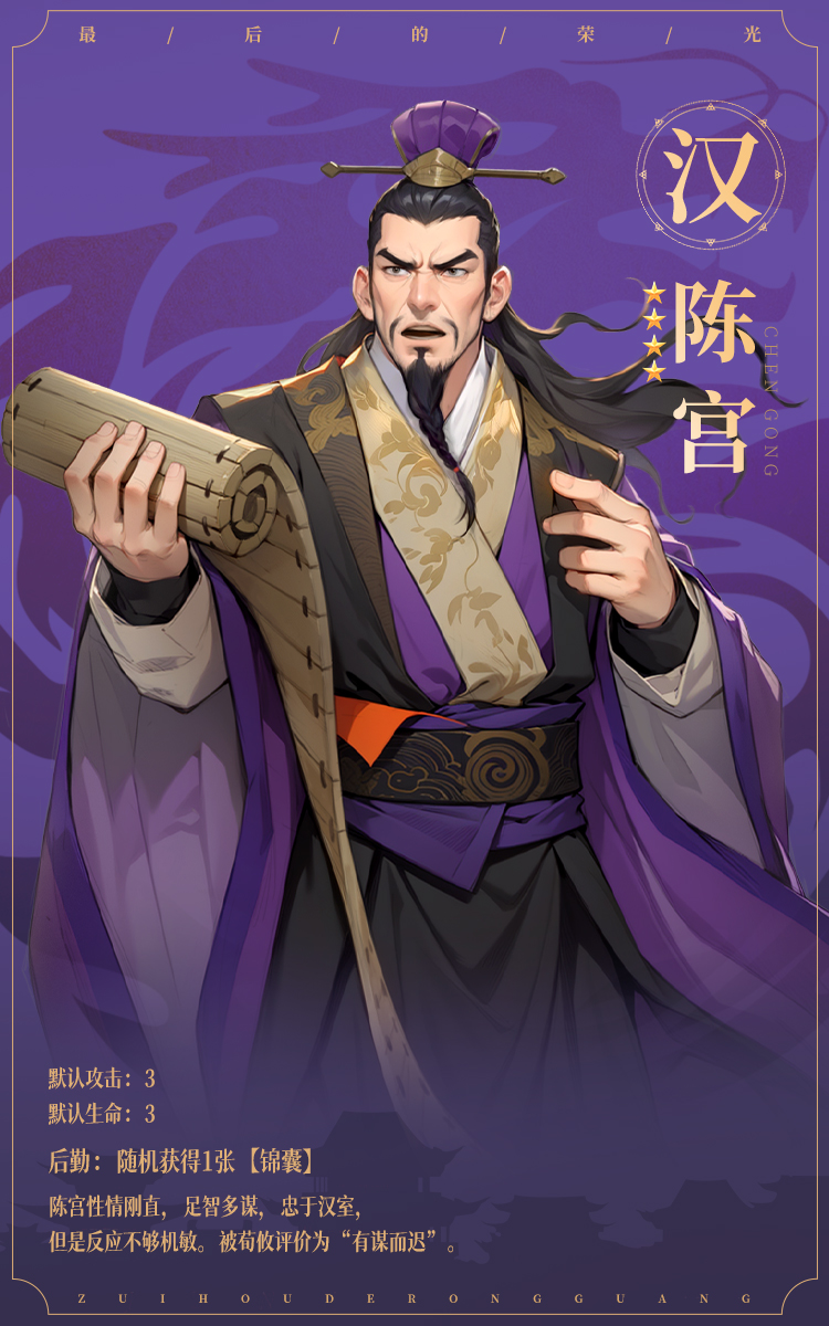 今天给大家带来了《最后的荣光》名将图鉴——陈宫,陈宫性情刚直,不畏强权,敢于直言进谏。辅佐曹操时,他曾为曹操争取到兖州牧的位置,并帮助曹操平定了青州黄巾军。然而,由于曹操杀害汉末名士,陈宫与之反目,并最终选择跟随吕布。游戏中陈宫是四星随从,技能后勤: 随机获得1张 【锦囊】。