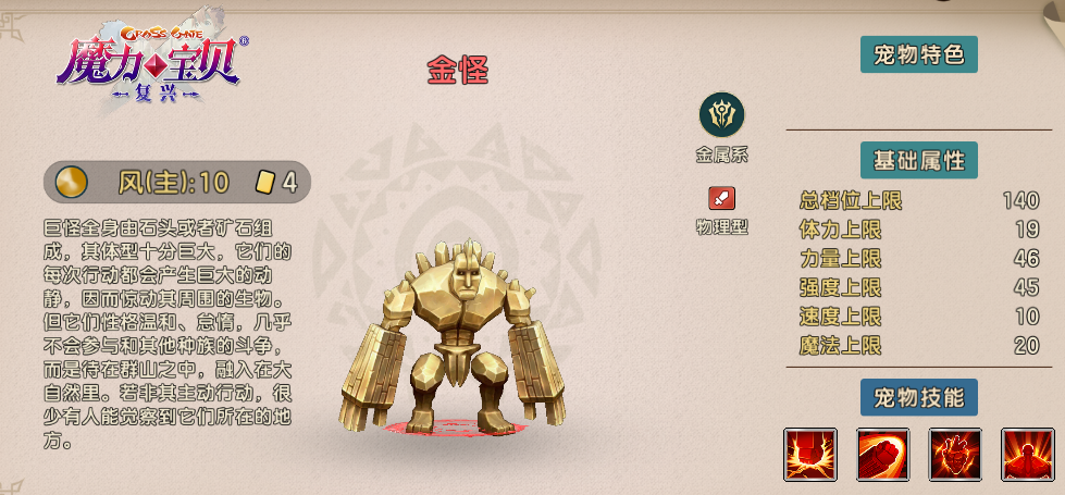 刘亦菲代言的《魔力宝贝:复兴》手游公测上线,新的宠物巨怪科上线,巨怪科是一科兼顾防御和输出的宠物,不管是【钢之拳】被动技能,还是【钢之心】被动技能,巨怪科都能够将自身一定的防御能力有效的转变为自己的输出能力,对敌方造成打击。接下来给大家带来了《魔力宝贝:复兴》金怪技能图鉴,一起了解一下吧!