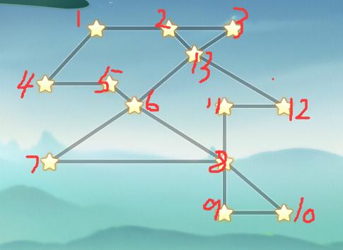 1、一笔画玩法,不能重复,全部连接星星