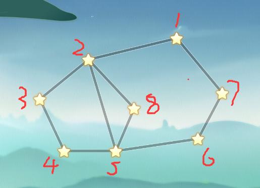 1、一笔画玩法,不能重复,全部连接星星