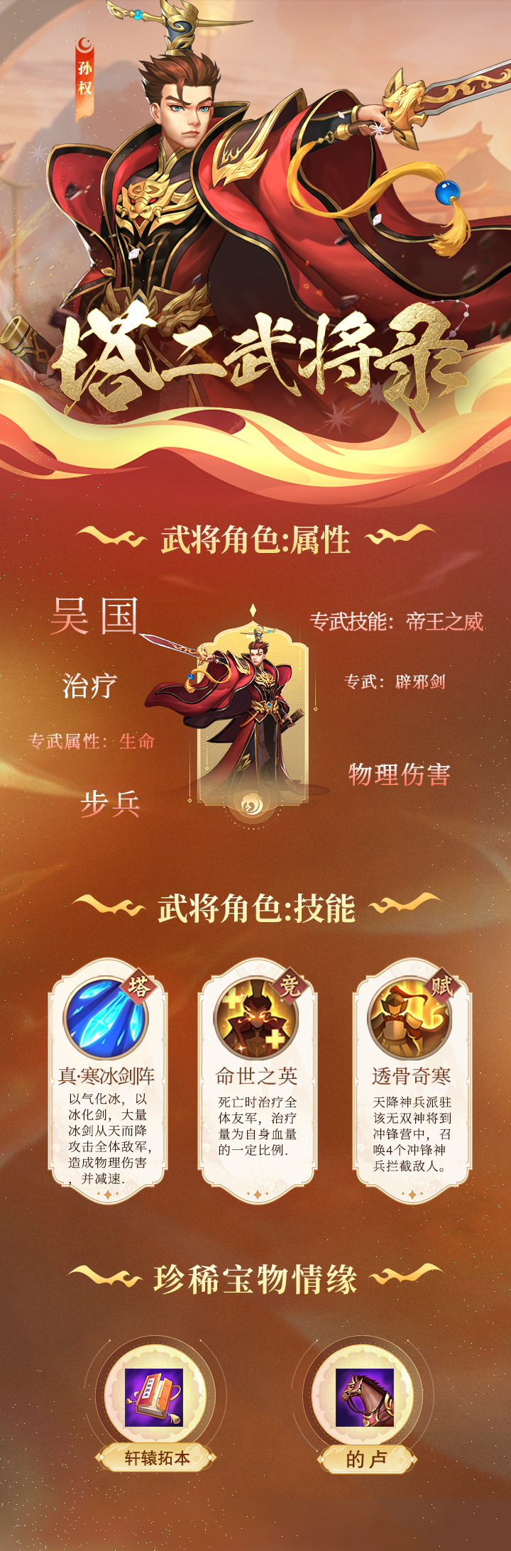 孙权作为辅助武将,对战技能在死亡时触发,需要后期专武技能达到3级才能发挥战前最大优势,是个后期适合培养的英雄。