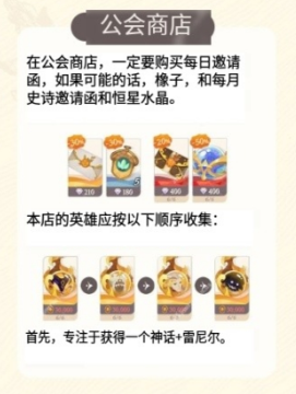 2、此外尽早加入游戏公会,可以解锁公会商店,通过完成公会任务来积累点数,购买性价比极高的公会物资来壮大自身。