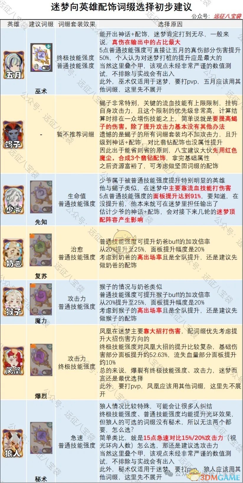 2、配饰优先养成英雄及词缀选取建议