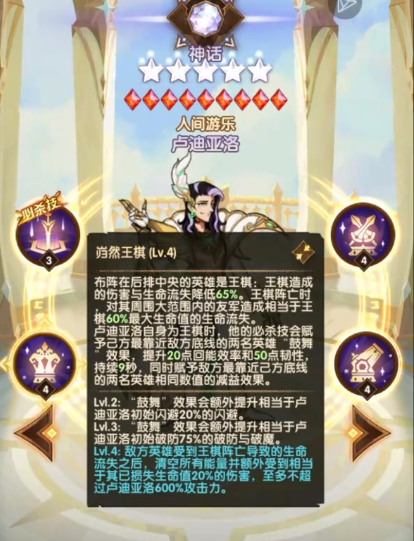 卢迪亚洛在游戏里属于一个神话级别的角色,角色的大招名叫戏弈棋布,在对战开始的时候,这个角色可以立即使用必杀技,并且角色是不需要消耗能量的,在使用这个技能的时候,角色还能获得免疫控制的效果,另外这个角色并没有严格意义上的放置位置限定,放置在前排角色就是近战,放置在后排角色就是远程攻击,另外等角色提升到2级之后,释放必杀技只需要消耗800点即可,角色提升到3级之后,消耗600点就能使用必杀技。