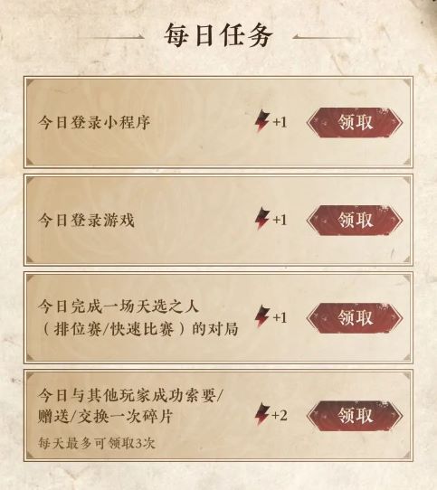 5.可以通过完成每日任务领取体力,比如登录小程序、登录游戏、完成一场天选之人对局或者与其他玩家成功索要/赠送/交换一次碎片;