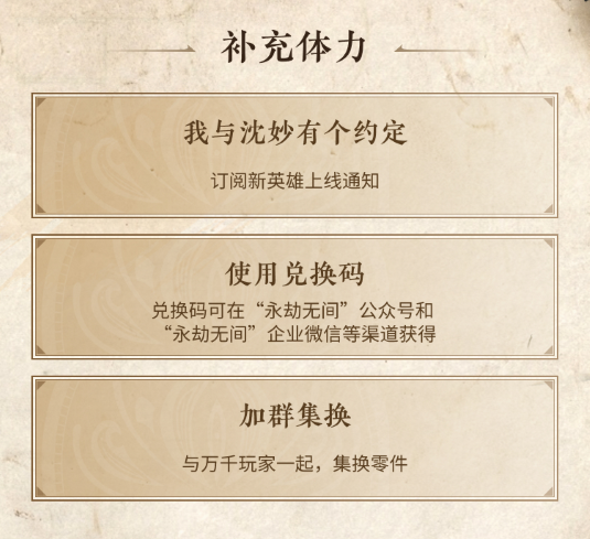 6.还可以“补充体力”,通过以下途径获得额外体力,如下图中订阅新英雄上线通知、使用兑换码、加群集换即可获得额外体力。