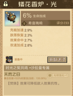 拉曼的专属遗物镂花香炉,会有6%的生命加成,另外还有充能加速,跌落恢复,以及效果命中。这一位火系输出在保证生存的同时,技能循环就会更加的流畅。同为火系输出的大卫专属的遗物就是塞莱斯之穹光会有百分7的暴击伤害,如果是搭配效果抗性,还有秒杀加成以及效果命中,就可以有效满足爆发输出定位。专属文明赞美星空,就可以让暴击伤害直接更上一层楼。