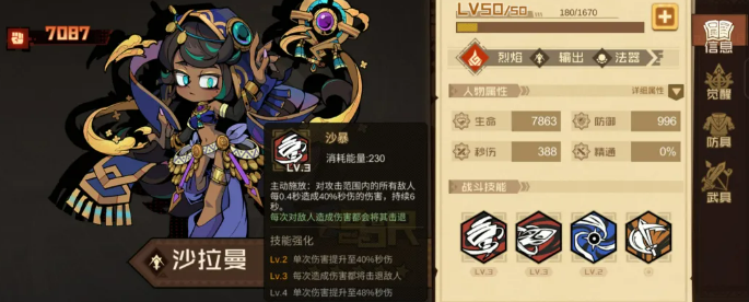 薇薇安在这套阵容里定位是副输出。她的被动可以缩短自动技能的冷却时间,让自动技能的释放频率更高。而她的自动技能爆裂模式,可以给敌人挂上燃烧状态,而且有三段伤害,每段都能触发天罚之日的增益,同时也触发自身被动的减冷却效果。燃烧挂上去之后,沙拉曼的沙暴伤害会更高,两个角色之间的联动就是靠这条线串起来的。