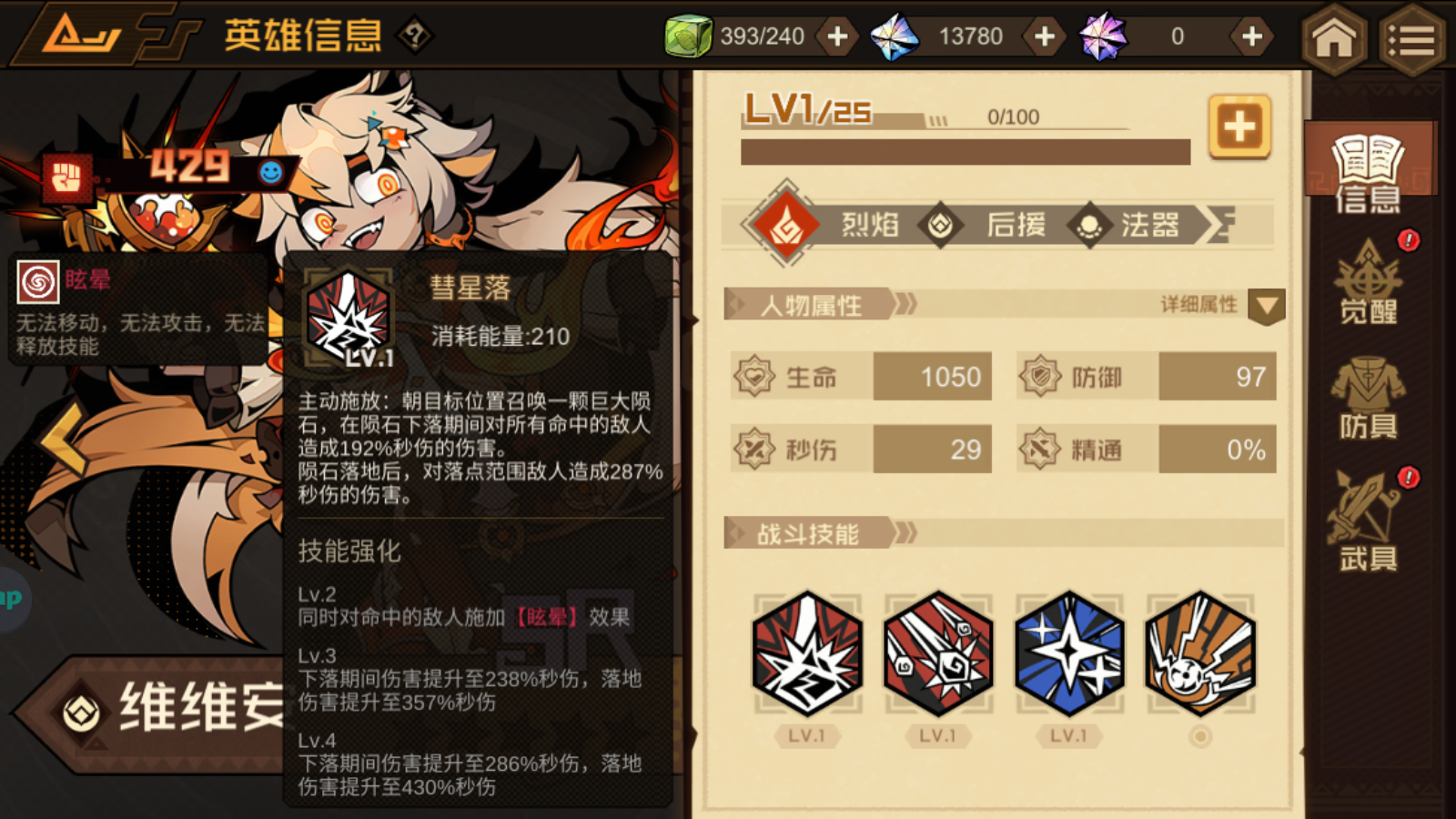 技能介绍:同时在攻击范围内随机3个敌人的位置上召唤一颗小型陨石。对命中的敌人造成141%秒伤的伤害,并对其施加【燃烧】效果,持续15秒,若陨石命中空中单位,有额外30%概率施加【晕眩】效果,持续3秒