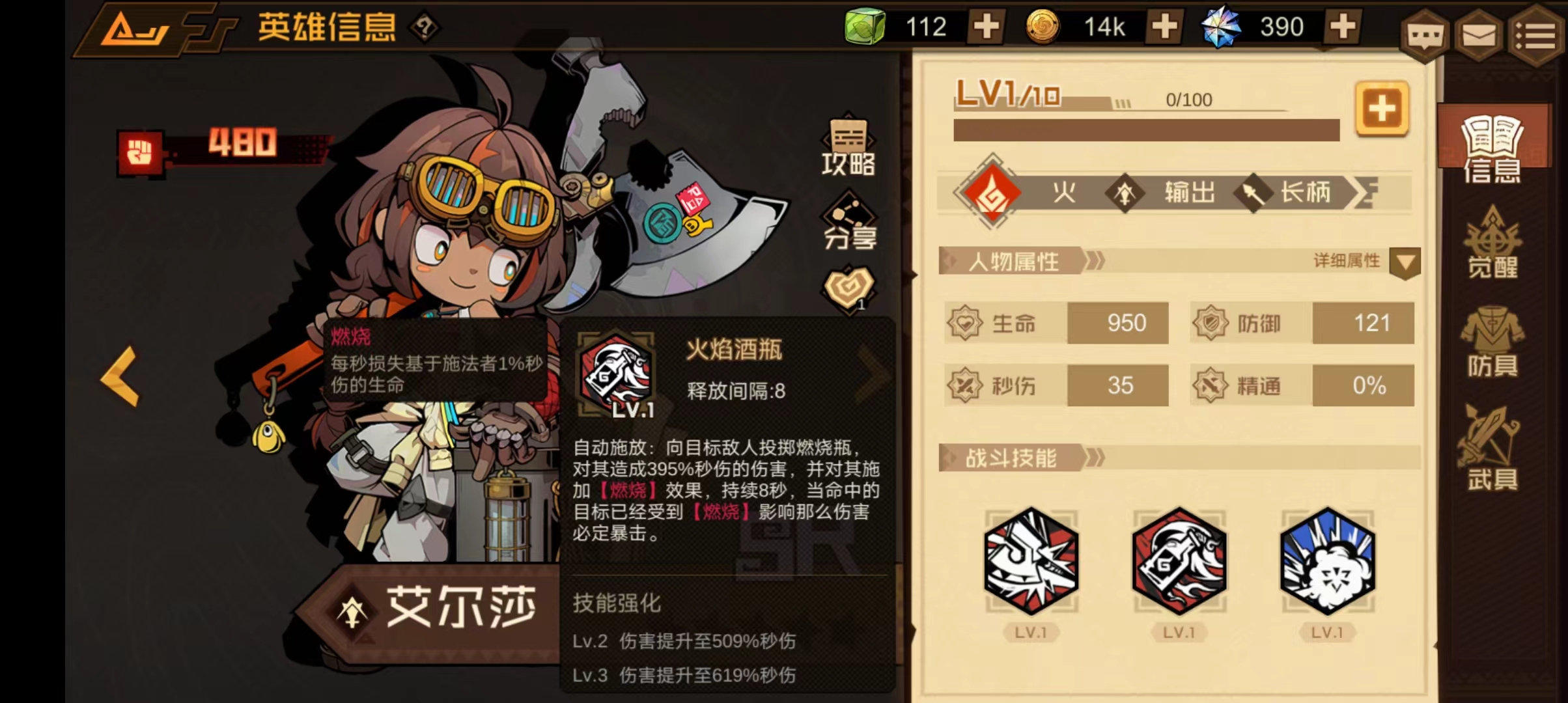 技能介绍:自动施放:向目标敌人投掷燃烧瓶,对其造成395%秒伤的伤害,并对其施加【燃烧】效果,持续8秒,当命中的目标已经受到【燃烧】影响那么伤害必定暴击