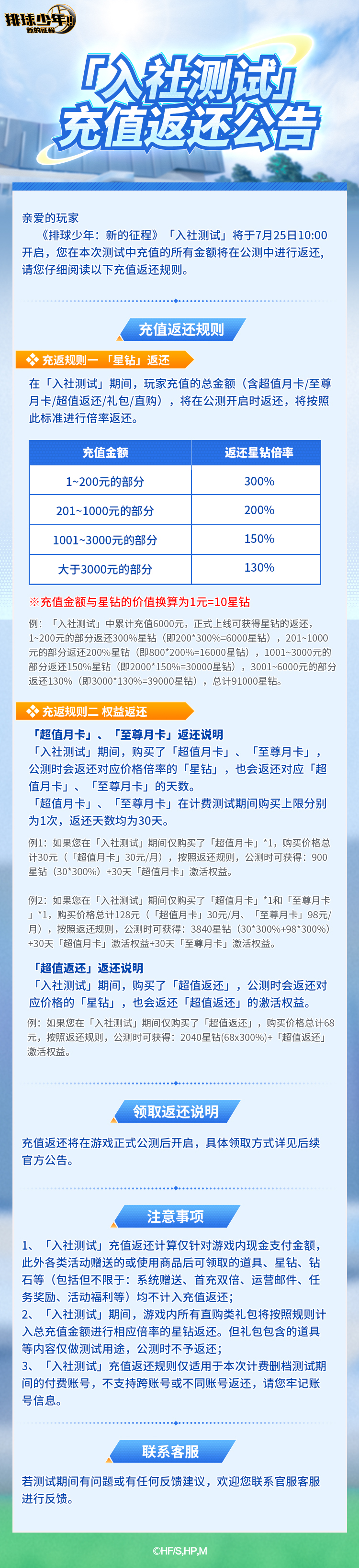 《排球少年:新的征程》「入社测试」为限号计费删档测试,本次测试将开放付费功能。测试期间的充值内容将在游戏上线后,按照一定比例返还。具体返还规则说明如下: