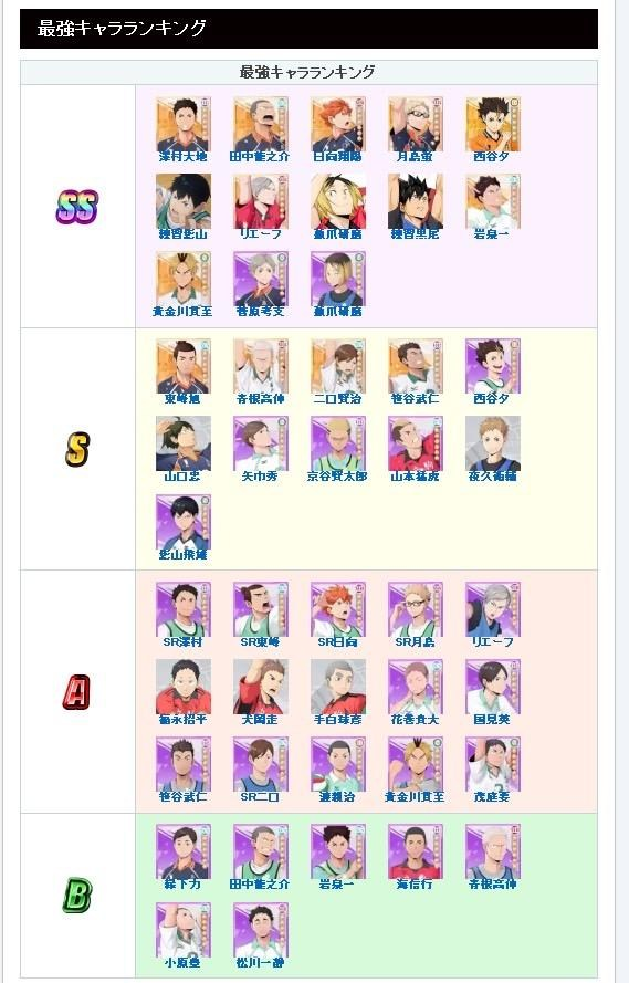 菅原:前期非常实用的举球员,及川出来之前最好的强打S。有东峰的话更需要他,有羁绊跟技能的体力加成,但共鸣也要练起来比较好