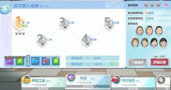 5、练习赛有通关星数,首次以三星通关可以获得较多的训练素材与抽取球员的招募券。