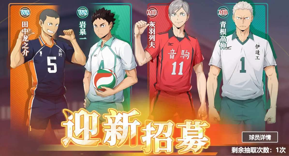 「田中龙之介」这个角色抽到后可以组建乌野体系,而且角色本身的强度也非常优秀,定位强攻,有着很不错的输出能力,前期开荒阶段会非常好用。