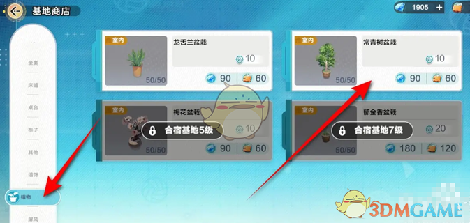2、来到合宿基地后点击基地商店前往,找到绿植后,选择常青树盆栽购买;