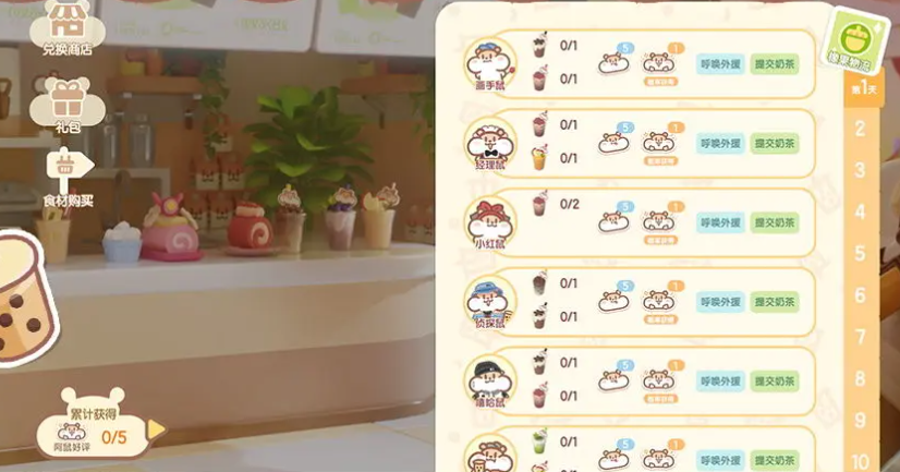 发展家们一定要严格根据需求来制作奶茶,完成制作后就可以提交,大家每成功完成一次订单,必定会得到阿鼠认可,并且有一定的概率获得阿鼠好评,一般只要完成当日所有订单,保底是能获得1个好评的。