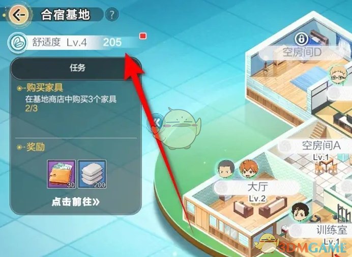 2、然后在合宿基地页面,点击左上角的舒适度前往;