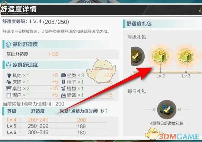 3、在舒适度详情页,点击达成的等级礼包进行领取;