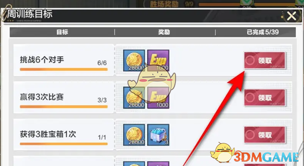 答:前往训练馆内,点击周训练目标即可领取奖励