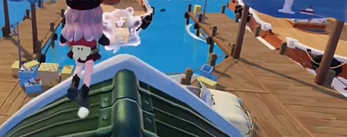 3、前往码头,在【比尔】身后房子屋顶上面找到小狗泡泡,触碰即可获得线条小狗冲呀地毯。