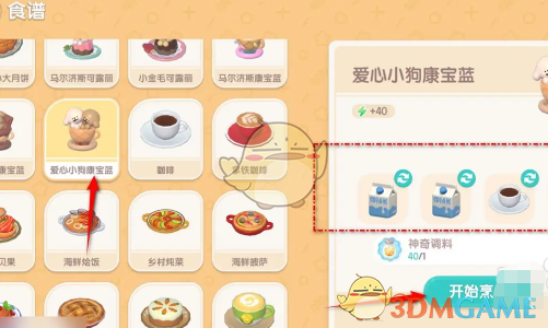 2、打开料理食谱选择爱心小狗康宝蓝,准备2份咖啡以及2份牛奶,在右下角点击开始烹饪。