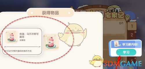 3、完成购买后即可获取任务奖励-马尔济斯可露丽食谱,点击学习就可以解锁马尔济斯可露丽食谱了。