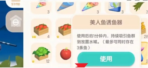 2、接着,按照系统给出的提示,进入背包页面。在背包页面中,认真查看其中的各种物品,找到美人鱼诱鱼器道具并点击它。